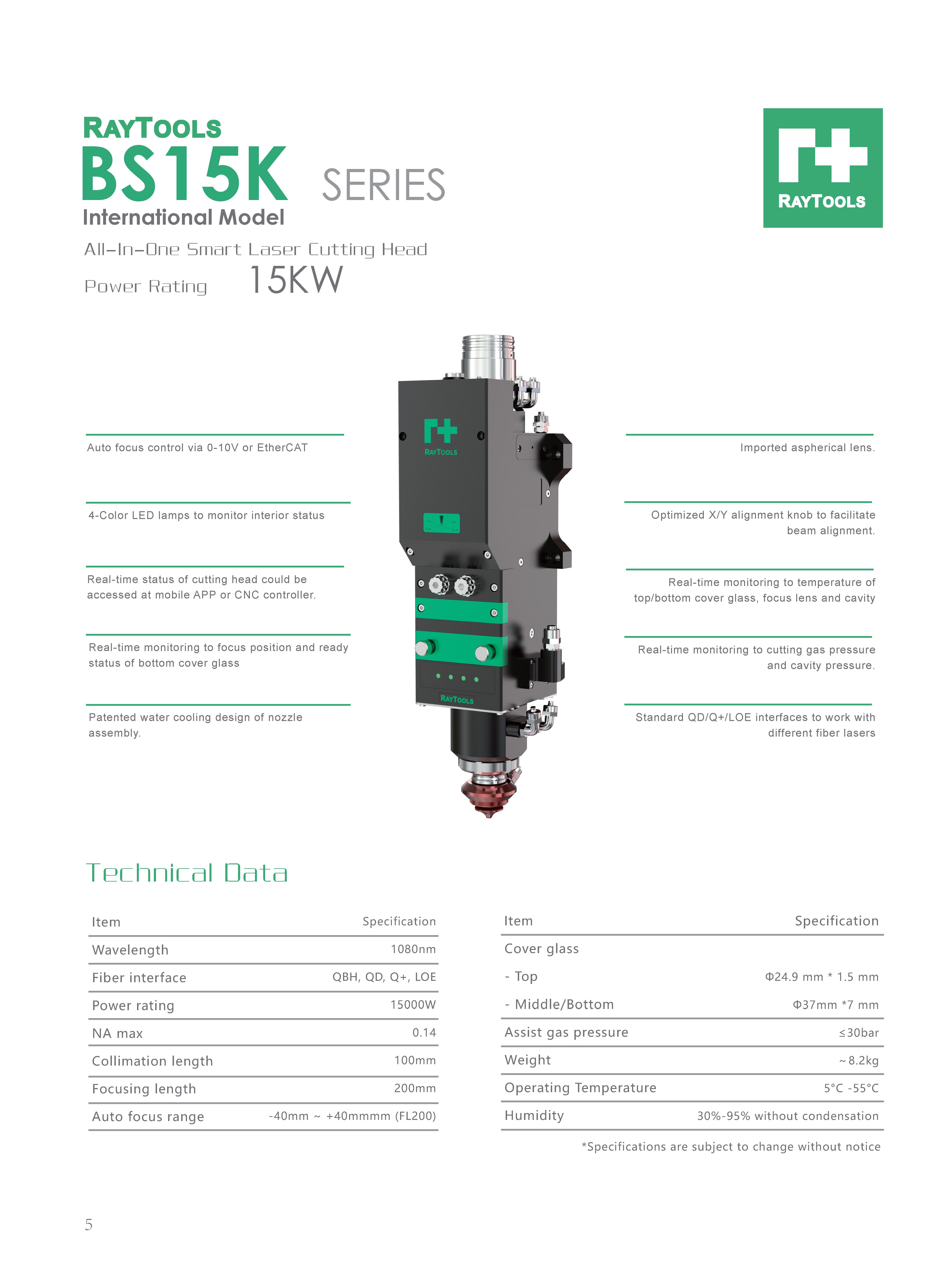 Power rating 15KW; Fully smart sensor technology with real-time status monitoring by APP or CNC; Auto focus by 0-10V or EtherCAT.