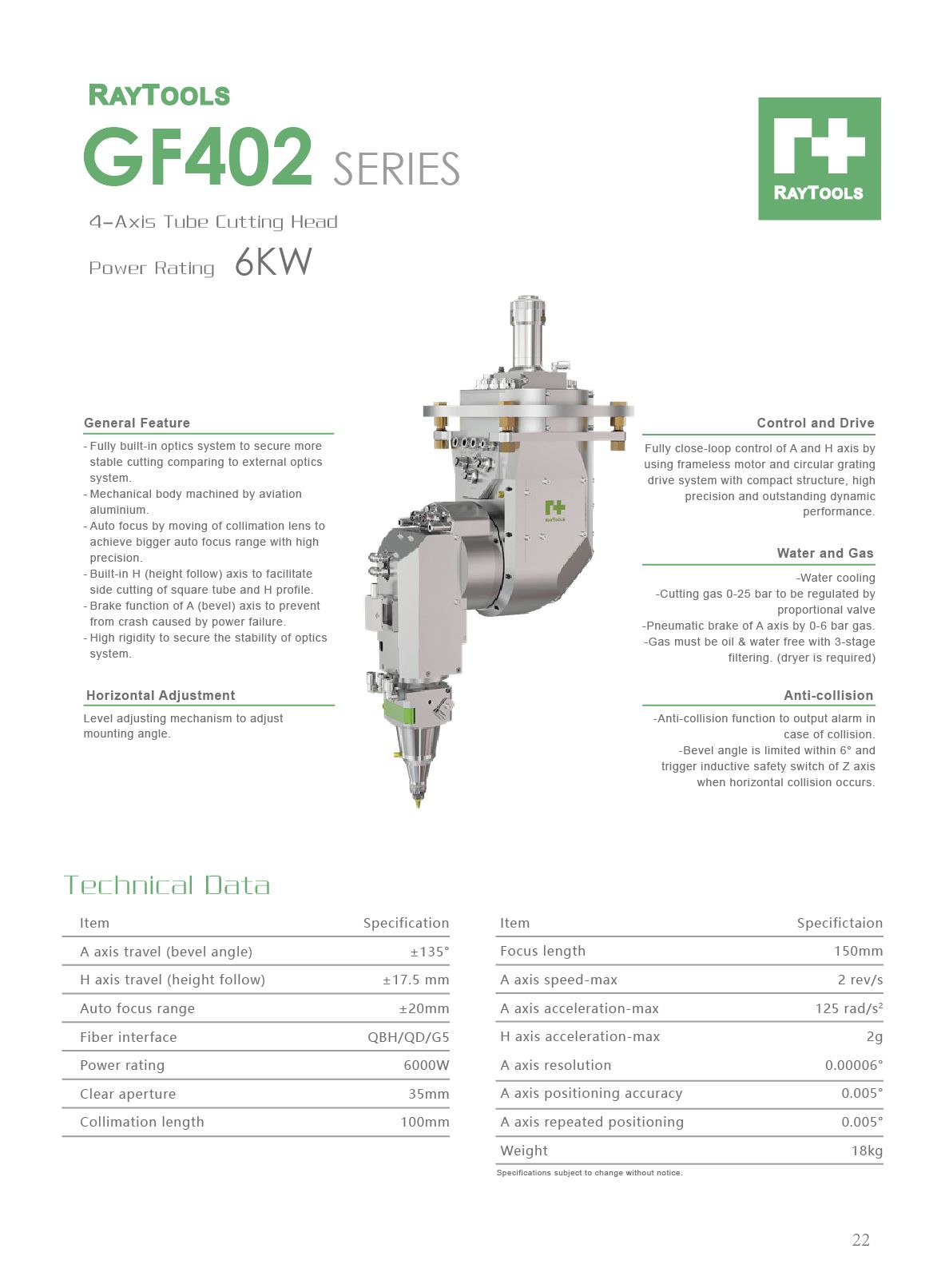 Power rating 6KW. Bevel laser cutting for tube. Fully built-in optics system.