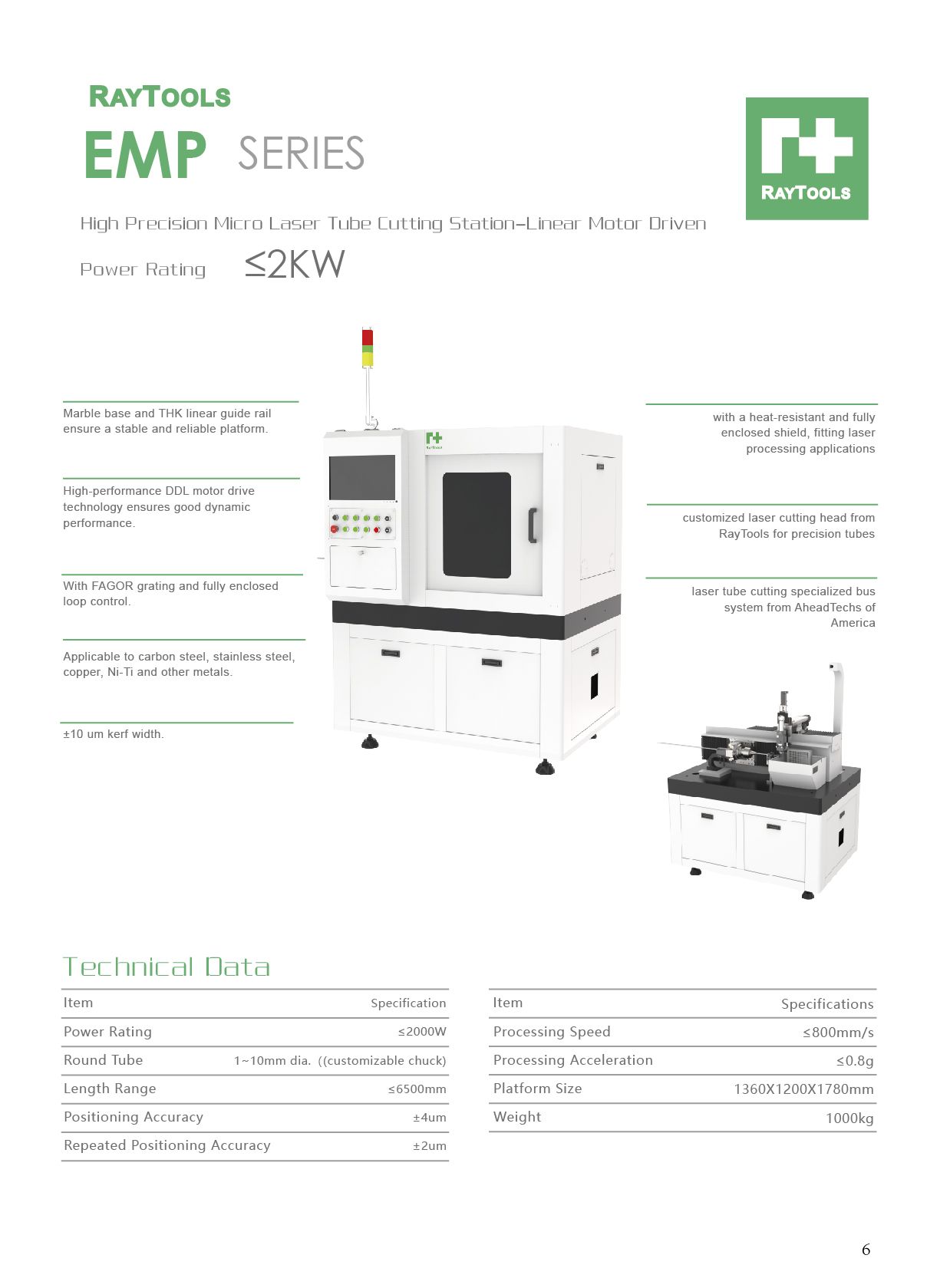 Processing size 1-10mm (Dia) x6500mm (L); Linear motorized axis; CNC based on EtherCAT; Raytools cutting head.