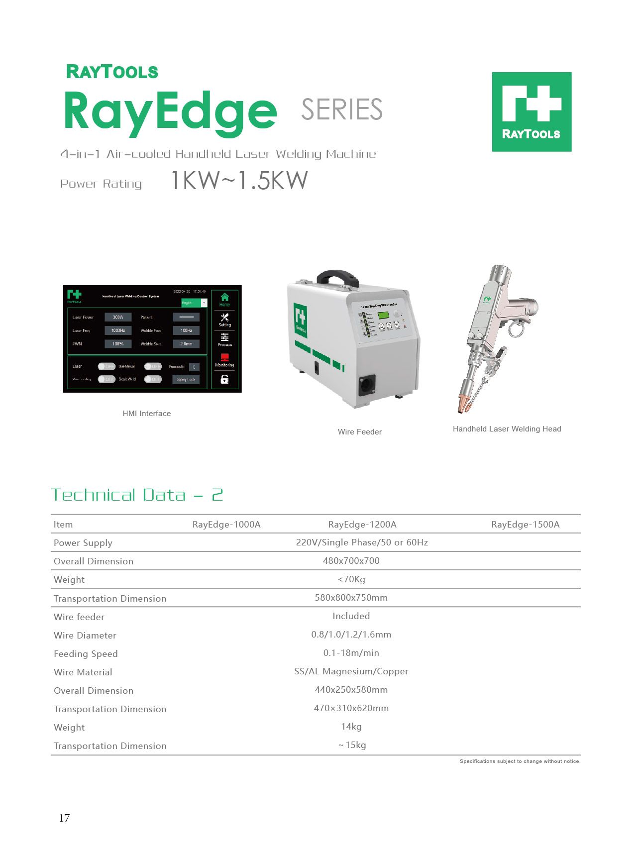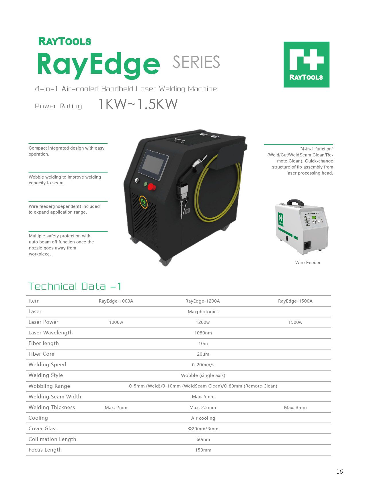 4-in-1 handheld laser application (welding/cutting/weld seam cleaning/remote cleaning). Laser power 1~1.5KW.