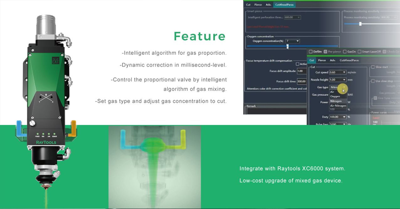 Power rating 12-100KW. Controller XC6000 + CAT MIX Series Laser Cutting Head BS15K CAT MIX~BS100K CAT Plus MIX. Automatic gas mixing inside cutting head.