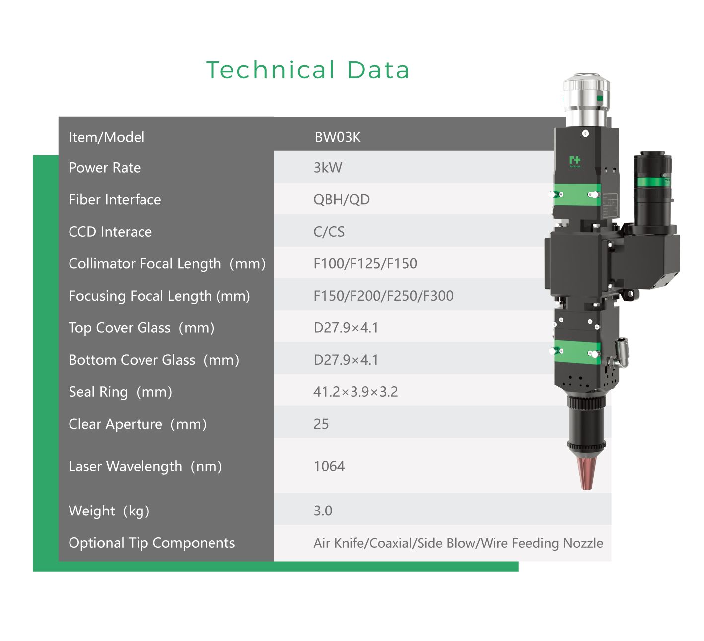 Power rating 3KW; Low power laser welding; Fiber/Diode/Blue version to match fiber laser, direct diode laser or blue laser.