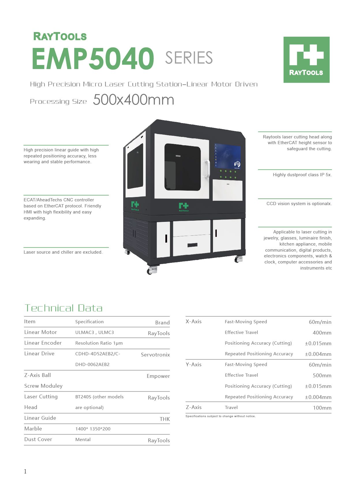 Processing size 500x400mm; Linear motorized X and Y axis; CNC based on EtherCAT; Raytools cutting head.